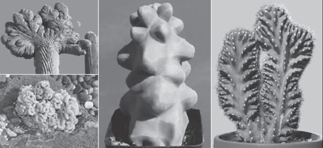 圖片從左至右、從上到下依次為:鳳頭仙人掌(Carnegiea gigantea);“大腦仙人掌”(Mammillaria elongata cristata);“圖騰柱仙人掌”(Pachycereus schottii f. monstrosus)和牙買加天輪柱(Cereus jamacaru f. cristatus)。